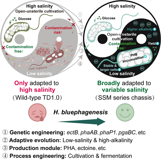 实验室突破性地选择嗜盐菌(Halomonas)作为底盘微生物,其独特优势在于:耐受高盐环境、无需灭菌培养、可利用廉价碳源(如秸秆水解物、二氧化氮等),大幅降低生物制造的能耗与成本。团队通过基因编辑与合成生物学技术,重构嗜盐菌的代谢通路,实现聚羟基脂肪酸酯(PHA)及其他多种产物的高效合成,显著提升工业生产的稳定性和经济性。相关成果已应用于万吨级产业示范,树立了以极端微生物驱动生物制造的新标杆。