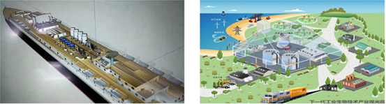 图4生物制造2.0: 基于嗜盐菌合成生物学的绿色生物制造. 生物制造2.0可以在远洋的大型船只上进行, 也可以在海岛上进行, 充分利用充裕的海水, 以及风电、 海潮发电, 实现不与人争水, 不与人争地的绿色可持续目标, 也可以发展成为观光产业, 让民众参观生物制造的同时, 感受可持续发展的概念