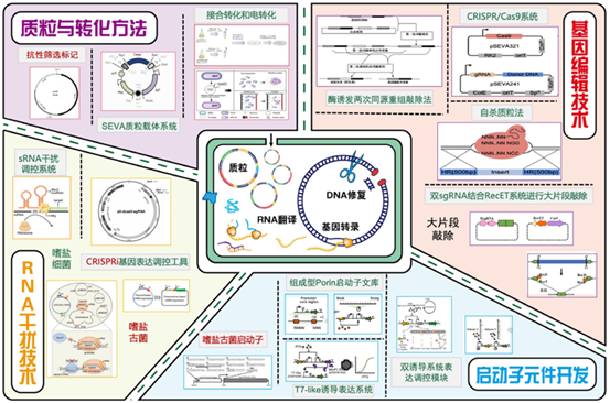 嗜盐菌分子生物学工具的开发是其合成生物学应用的核心突破。针对野生型菌株代谢产物单一、产量低的局限,近20年来研究者攻克了遗传背景不清、工具匮乏的挑战,开发出系列专用工具: